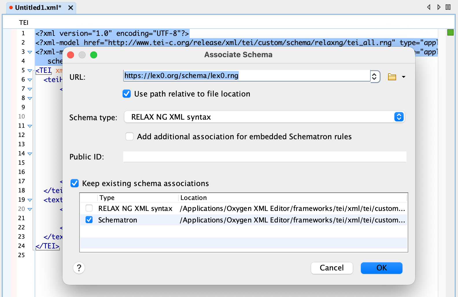 https://lex0.org/schema/lex0.rngusing the Schema Association dialog (Document > Schema > Associate Schema, or the red-pin icon).Figure 2: Associating schema in oXygen XML Editor![]()